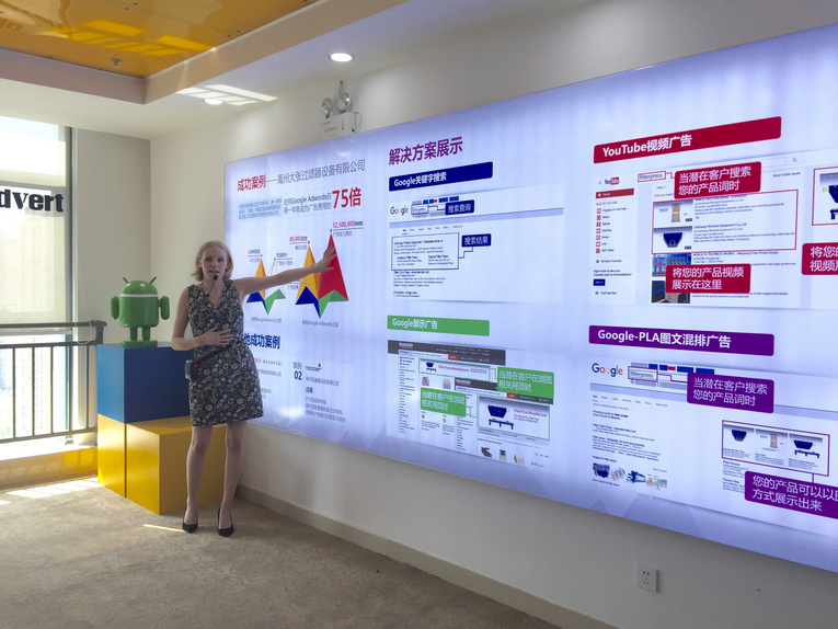 公司负责人热情接待了全体参观人员,首先为大家介绍该公司的数据整合平台,囊括国家地区、网站、搜索热点、点击量、成交量、男女占比等诸多数据。接着从Google总部直接委派过来的英国员工对 “Google Adwords”进行了详细介绍,指出它一种通过使用Google 关键字广告或者Google遍布全球的内容联盟网络来推广网站的付费网络推广方式,其通过Google关键字搜索、Google展示广告、Youtube视频广告以及Google-PLA图文混排广告四种工具的使用,可以为企业带来丰厚的收益。公司负责人对Google trends、全球商机洞察、跨境宝、商贸通等多种信息网站进行具体演示和讲解,并带领我院师生参观了公司的会议室、健身房等,展示企业的工作环境和文化。最后在公司培训中心我院师生就有关跨境电商就业、大数据交流等问题与公司人员进行了深入探讨。