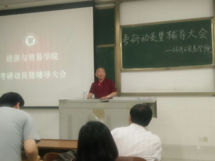 2016年7月1日经济与贸易学院考研动员暨辅导大会在F104顺利举行,经济与贸易学院院长柳思维教授、常务副院长彭炳忠教授、副院长罗双临教授、刘乐山教授、陆杉教授、党总支副书记颜建军博士出席本次大会。大会由颜建军书记主持, 13、14级准备考研的同学以及13级各班班主任、导师参加了此次大会。